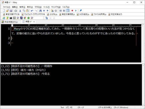 Meryのマクロの校正機能を試してみた。以前に作ろうとして表示周りの処理のいい方法が見つからなくて、記憶の彼方に追いやられ忘れていました。見直すと思っていたものがすでにあったので紹介してみる。 サーバー側で処理をするので校正の速度がワードや一太…